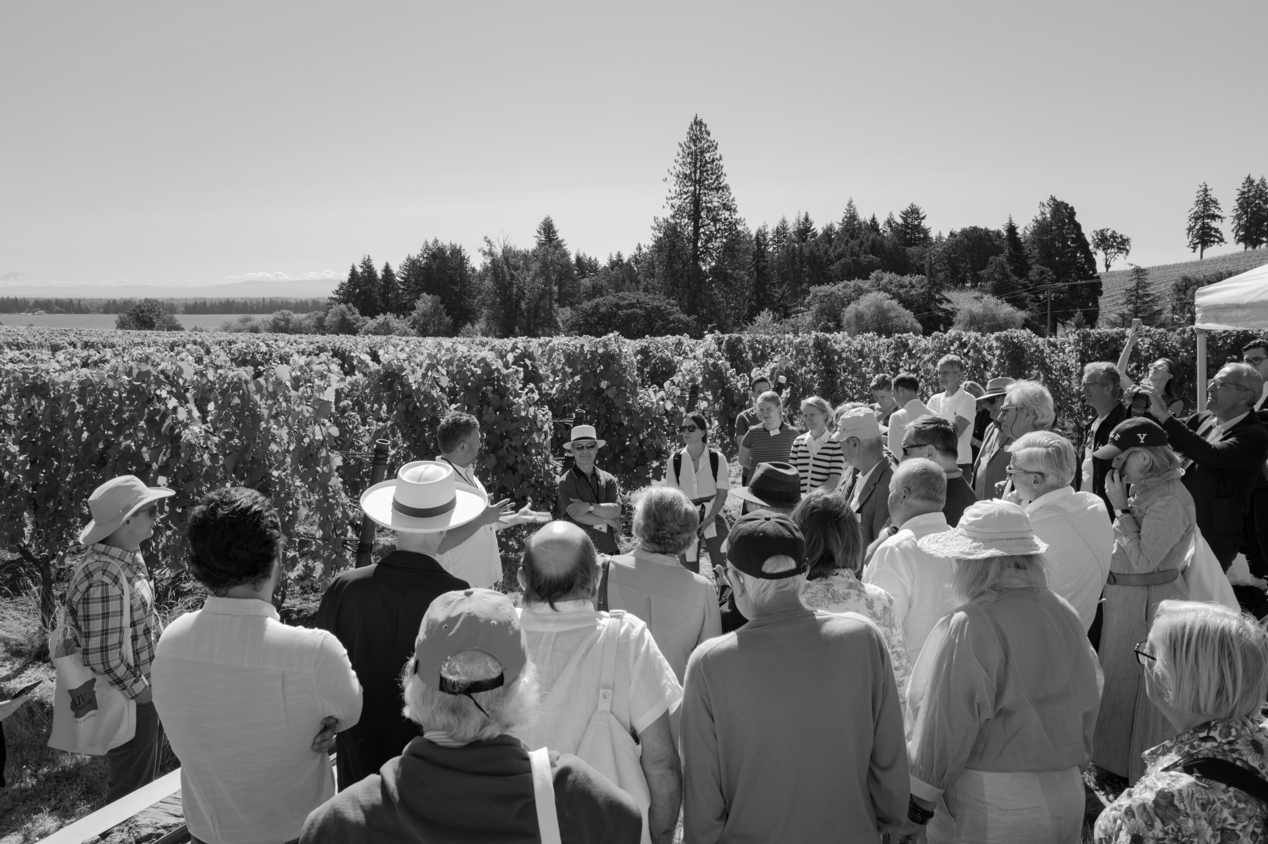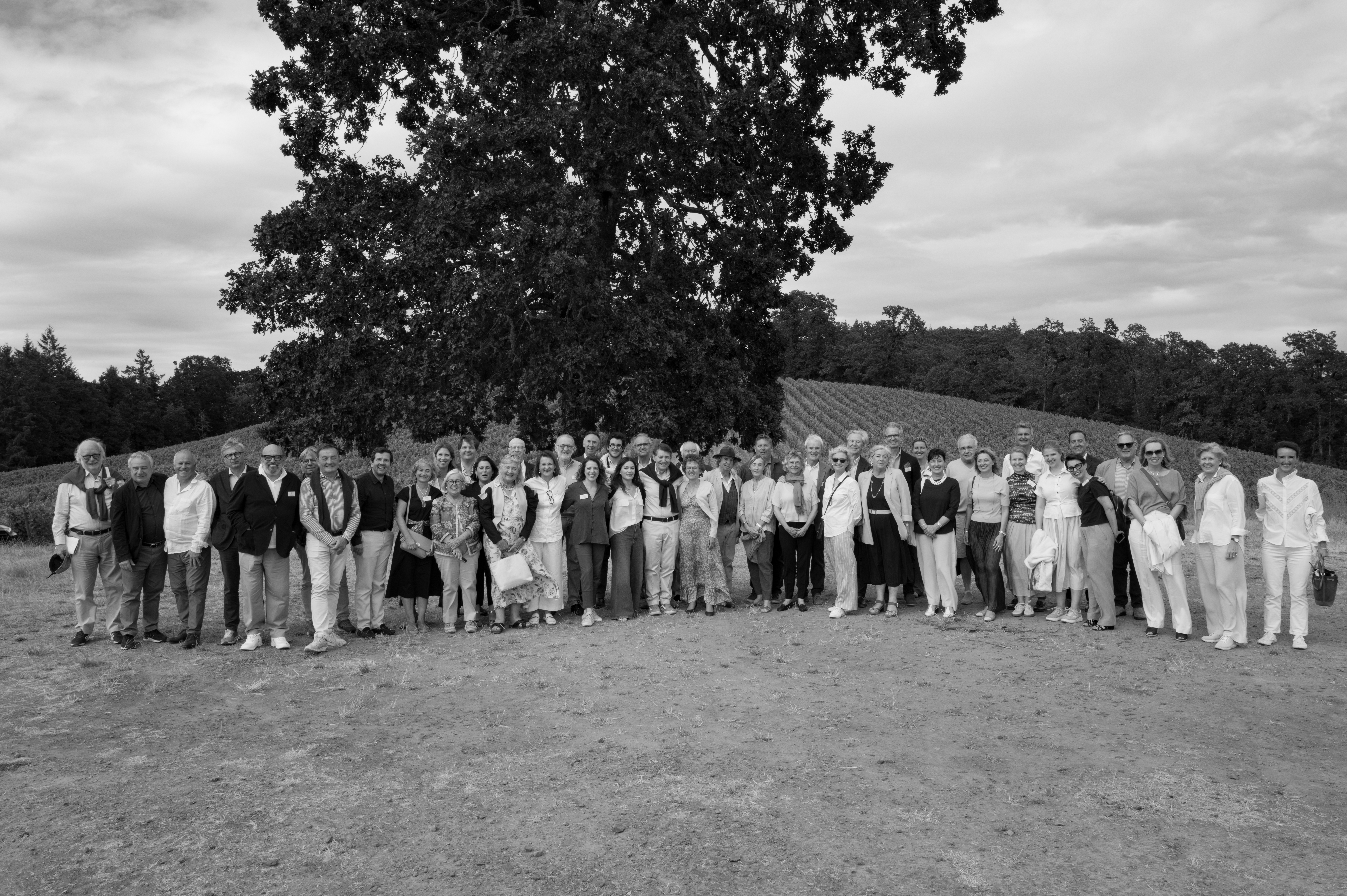 In early July, Bergström Wines, together with Résonance Wines, had the honor of hosting the Académie Internationale du Vin (AIV) in Oregon’s Willamette Valley. This distinguished association of fewer than 100 members from 20 countries is made up of multi‑generational winegrowers, scientists, agronomists, sommeliers, writers, Masters of Wine, and other leaders dedicated to preserving and advancing the traditions of fine wine. Founded in 1971 in response to the growing industrialization of wine, the Académie champions artisanal viticulture and the connection between great wines and the terroirs from which they come.